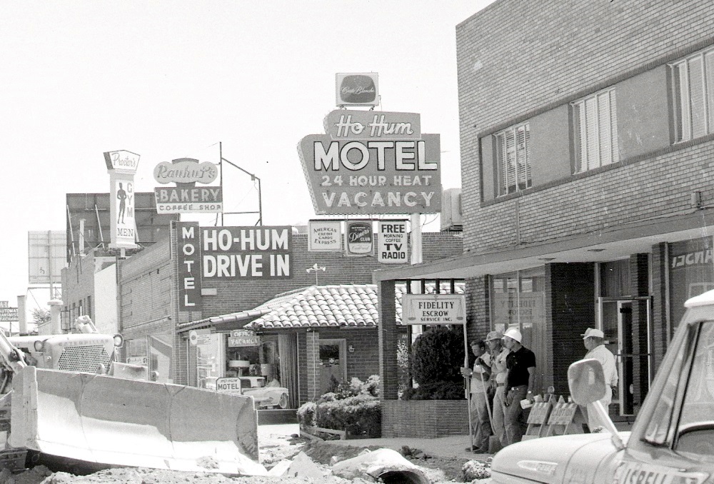 Pictured during a street widening project in the mid-1960s, the Ho Hum Motel was snuggled between commercial buildings on the busy thoroughfare. To its south, Rauhut's Bakery shares a building with Proctor's Gym for Men. | Date: 1965 | Source: Nevada Department of Transportation Download Original File