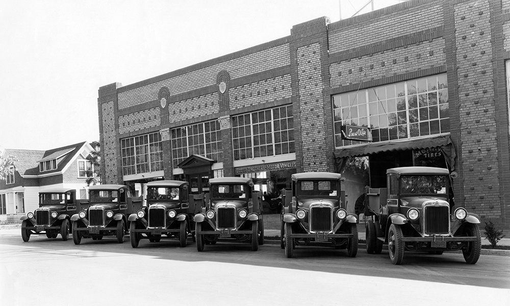 A row of trucks beckons customers outside the Osen Motor Sales building soon after a 1927 addition doubled its size. The house seen on the left was typical of the comfortable homes dominating this section of South Virginia Street at the time. | Date: ca. 1930 | Source: Special Collections, University of Nevada, Reno LibrariesDownload Original File