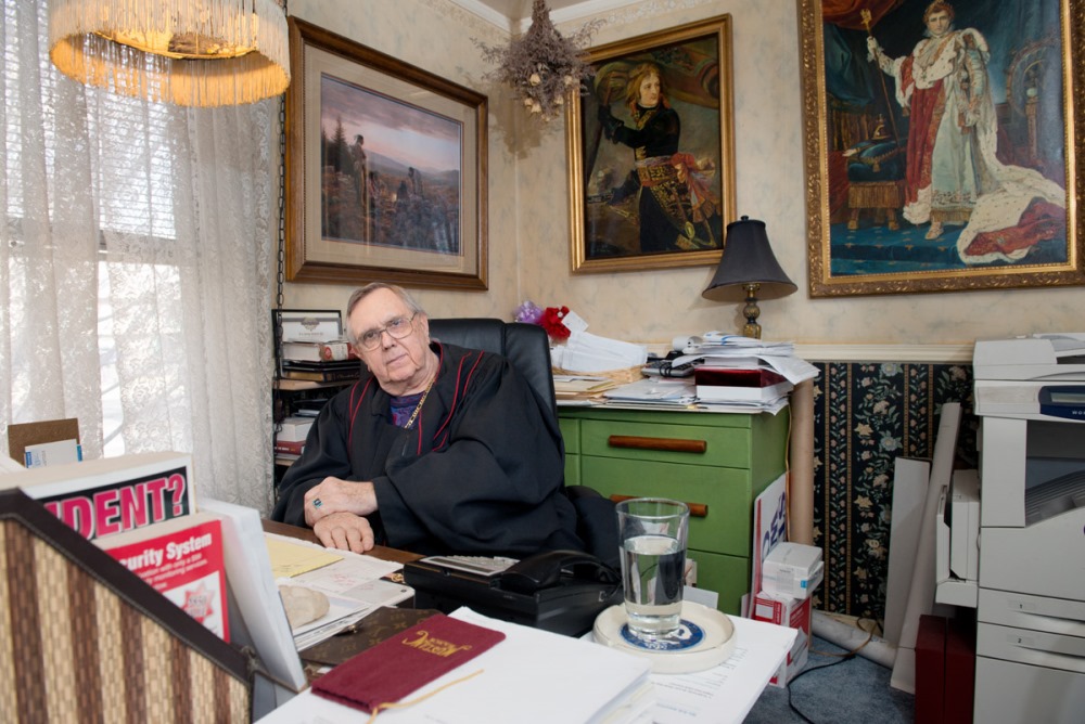 George Flint, minister ID: 109 | This file appears in: Chapel of the Bells Owner George Flint in his office at the Chapel of the Bells in 2013. | Creator: Patrick Cummings | Date: 2013 | Source: University of Nevada Oral History Program Download Original File CreatorPatrick CummingsSourceUniversity of Nevada Oral History ProgramDate2013 "George Flint, minister" appears in: Chapel of the Bells