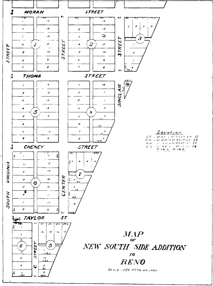 The South Side Addition, platted in 1903, kicked off home construction along South Center Street. Its eastern border was the route of the Virginia & Truckee Railroad, which paralleled Holcomb Avenue. The Martha Wingfield House is found in Block 5, Lot 12. | Date: 1903 | Source: Washoe County RecorderDownload Original File