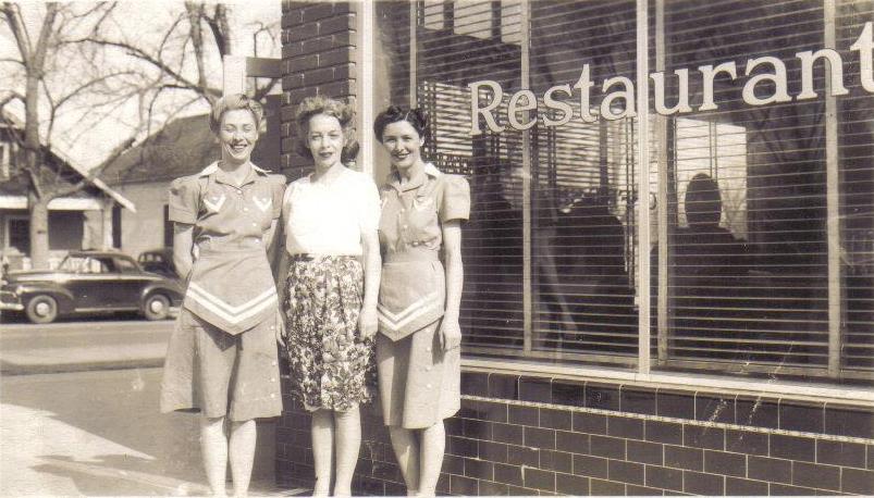 Pauline Granata and her sister, Tisha Blair, flank an unknown woman at the corner entrance to Heric's Restaurant. The houses in the background, on the east side of Virginia Street, demonstrate how residential much of the street still was in the 1940s.