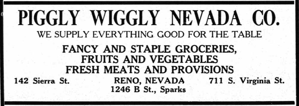 The Piggly Wiggly at 711 South Virginia Street was the third in the area. The first one opened at 142 North Sierra Street in 1925, and the second on B Street (Victorian Avenue) in Sparks earlier in 1926. All had very similar appearances. | Date: 1927 | Source: 1927-1928 Polk's Reno City DirectoryDownload Original File