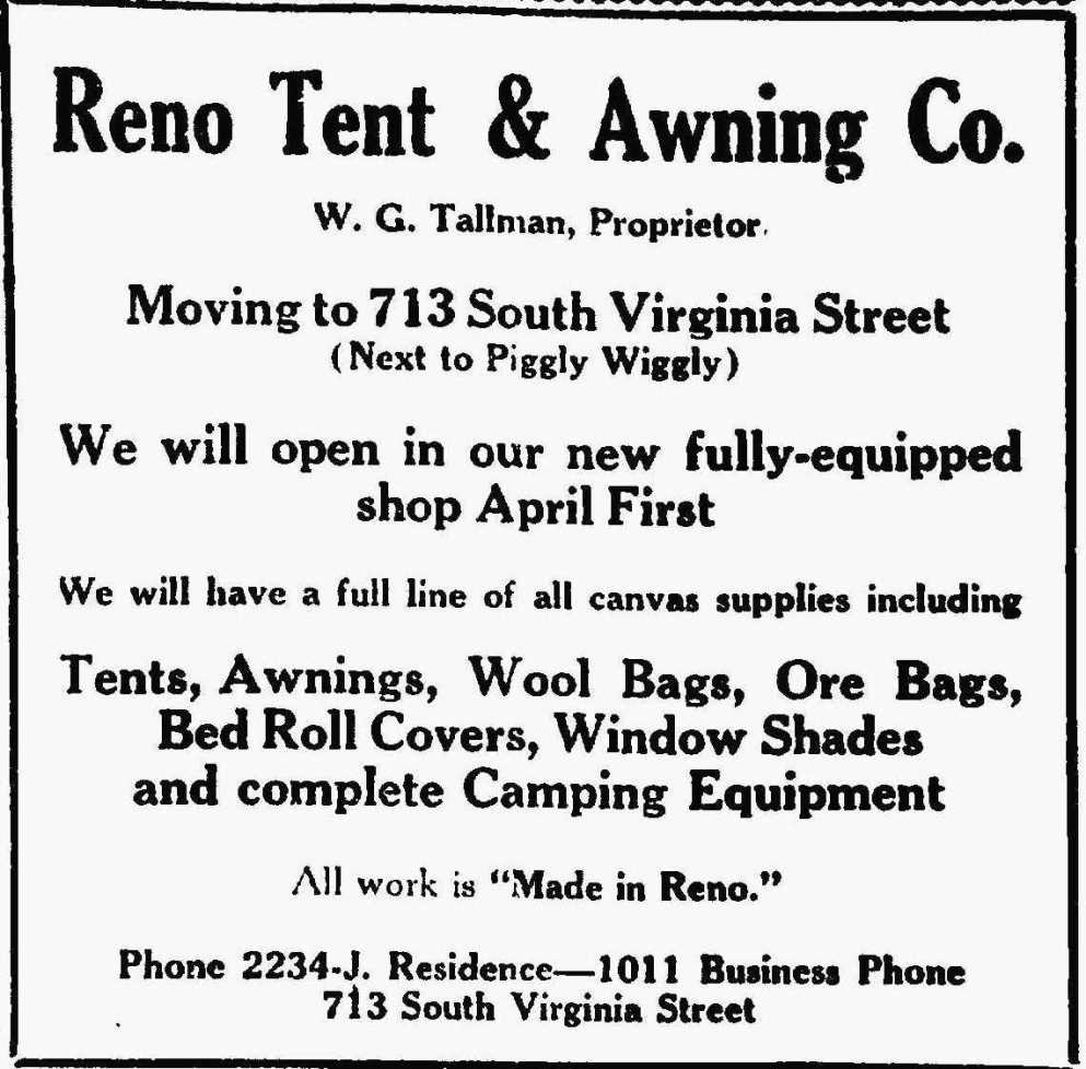Reno Tent & Awning ad ID: 1152 | This file appears in: Frohlich-DaCosta Corner The initial tenant of 713 South Virginia Street, the southern half of the building, was Reno Tent & Awning, a business formerly located on Stevenson Street. | Date: March 26, 1927 | Source: Reno Evening Gazette Download Original File SourceReno Evening GazetteDateMarch 26, 1927 "Reno Tent & Awning ad" appears in: Frohlich-DaCosta Corner