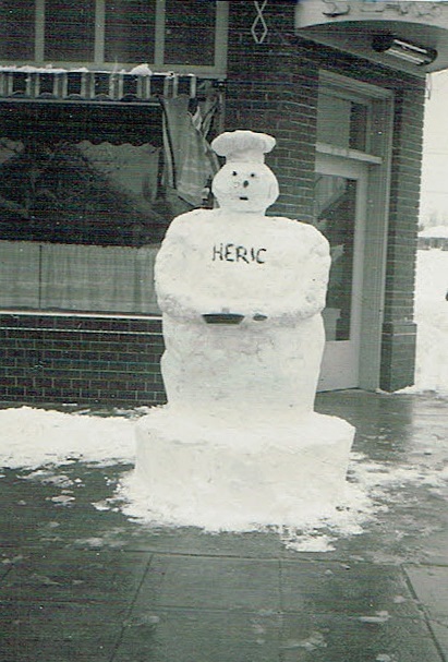 Snowman outside Heric's ID: 1154 | This file appears in: Frohlich-DaCosta Corner A frozen version of Jack Heric welcomes customers to the entrance of his restaurant in 1943, two years after it opened at 703 South Virginia Street. | Date: 1943 | Source: Joe Granata Download Original File SourceJoe GranataDate1943 "Snowman outside Heric's" appears in: Frohlich-DaCosta Corner