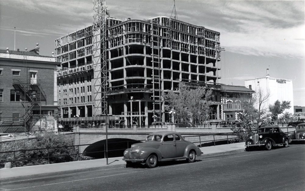 Costs were estimated at between $2,500,000 to $3,000,000, financed by the Bank of America, First National Bank of Nevada, and the Reconstruction Finance Agency, a depression-era federal agency. The YMCA and Majestic theater are visible to the right of the construction site. | Date: 1946 | Source: Special Collections, University of Nevada, Reno LibrariesDownload Original File