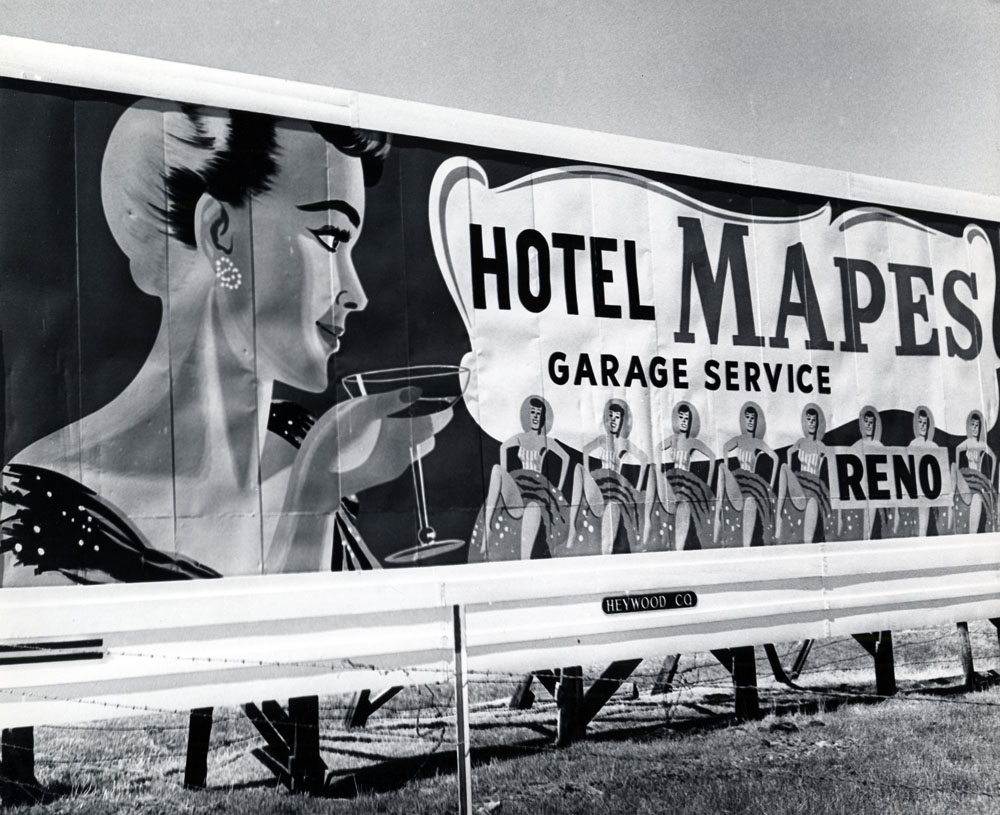 A 1955 billboard advertises the Mapes Hotel with a line of high-kicking Skylettes. | Creator: Gus Bundy | Date: 1955 | Source: Special Collections, University of Nevada, Reno LibrariesDownload Original File