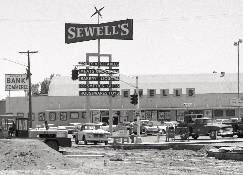 Street construction, 1965 ID: 1282 | This file appears in: Sewell's Supermarket Viewed during a street-widening project in 1965, Sewell's offered a large parking lot, crowned with an eye-catching sign visible from a long distance. | Date: 1965 | Source: Nevada Department of Transportation Download Original File SourceNevada Department of TransportationDate1965 "Street construction, 1965" appears in: Sewell's Supermarket