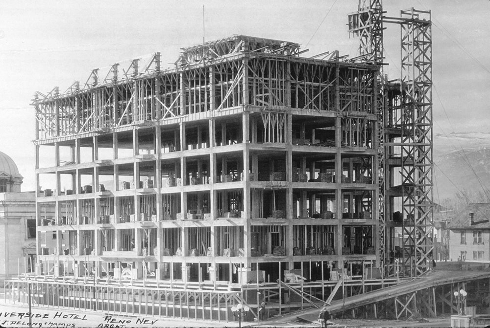 In spring 1926, George Wingfield announced his plans to build a new and luxurious Riverside Hotel. Construction began on July 27, 1926 and took almost ten months to complete. | Date: 1926 | Source: Neal Cobb