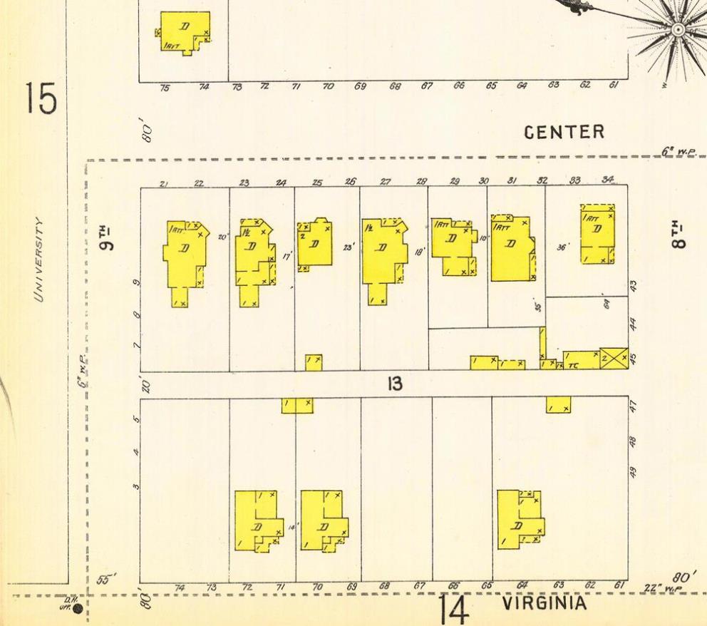 A map of the neighborhood south of the university in 1899 shows the Fulton House on the far left of the center row (the SW corner of 9th and Center). On Sanborn fire insurance maps, the color yellow denotes wood frame construction. | Creator: Sanborn Fire Insurance Company | Date: 1899 | Source: U.S. Library of CongressDownload Original File
