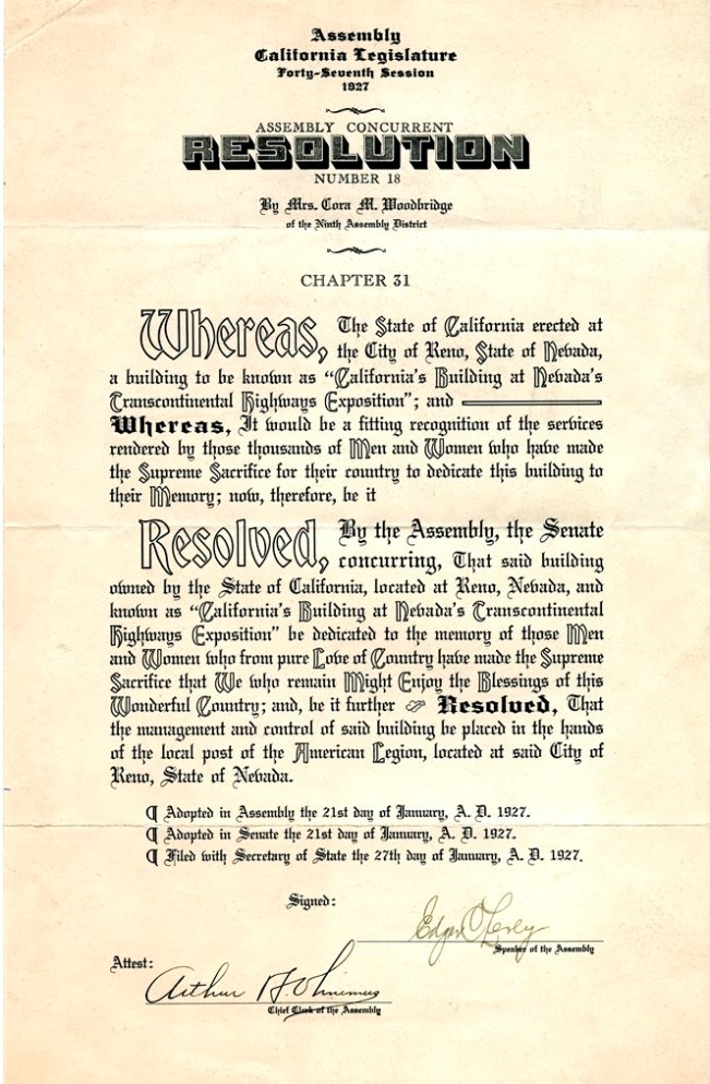 In January 1927, the California State Legislature adopted a joint Resolution gifting the California Building to the Reno post of the American Legion (effective upon the close of the Highways Exposition) and dedicating it to the memory of members of the military who made the ultimate sacrifice for their nation.