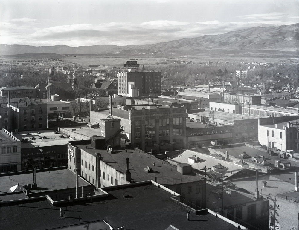 In this photograph, likely taken from the Mapes Hotel on Virginia Street sometime in the the 1940s (it opened in 1947), the El Cortez can clearly be seen towering above the other buildings in its vicinity. | Date: 1940s | Source: Special Collections, University of Nevada, Reno LibrariesDownload Original File