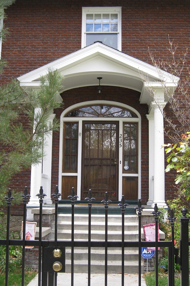 The front door of the house is flanked by beautiful sidelights and topped by a fanlight. The gabled portico is supported by Tuscan columns, which are unadorned and simple, with a plain, saucer-shaped capital and bold cornice. | Creator: Donna and Paul Erickson