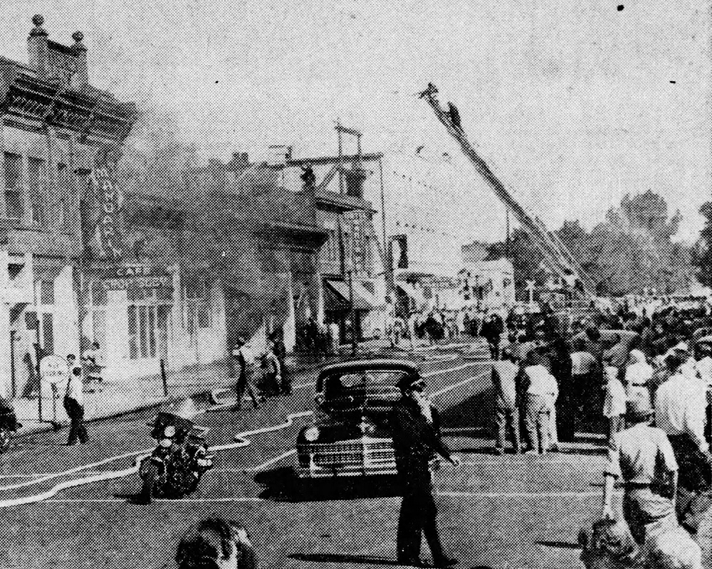 Block on fire, 1948 ID: 1672 | This file appears in: Santa Fe Hotel The original Santa Fe Hotel, seen in the center of this photograph, burned along with its Lake Street neighbors in a disastrous fire on August 15, 1948. | Date: August 15, 1948 | Source: Reno Evening Gazette Download Original File SourceReno Evening GazetteDateAugust 15, 1948 "Block on fire, 1948" appears in: Santa Fe Hotel