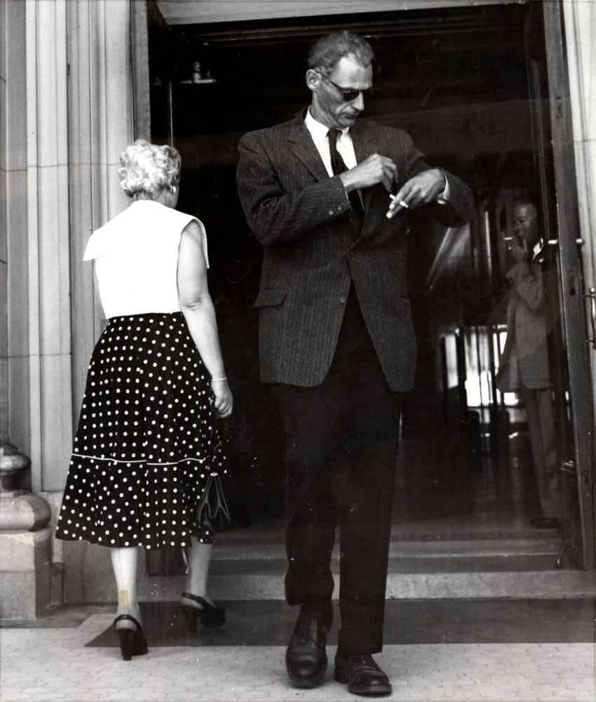 A celebrity divorce ID: 176 | This file appears in: Washoe County Courthouse Arthur Miller leaving the courthouse in 1956. | Creator: Edward Olsen | Date: 1956 | Source: Special Collections, University of Nevada, Reno Libraries Download Original File CreatorEdward OlsenSourceSpecial Collections, University of Nevada, Reno LibrariesDate1956 "A celebrity divorce" appears in: Washoe County Courthouse