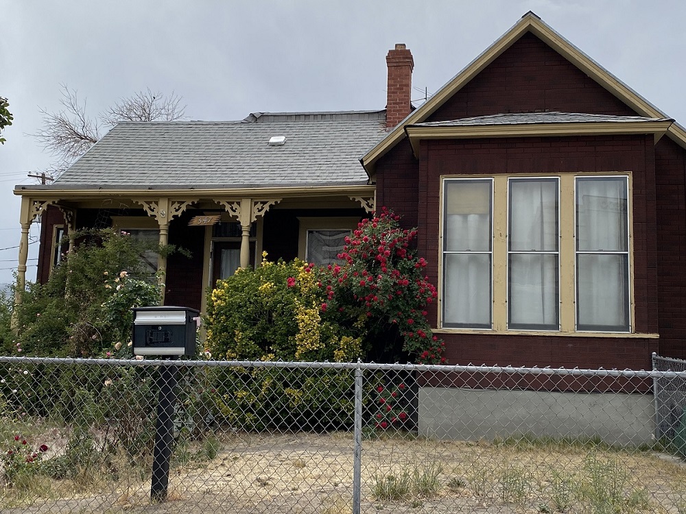 A close view of the front facade of the Benham House shows the detailed ornamentation of the porch supports. The architecture of the house is best described as Folk Victorian. The house is wood frame although surfaced in asphalt siding to resemble brick. | Creator: Alicia Barber | Date: 2021Download Original File
