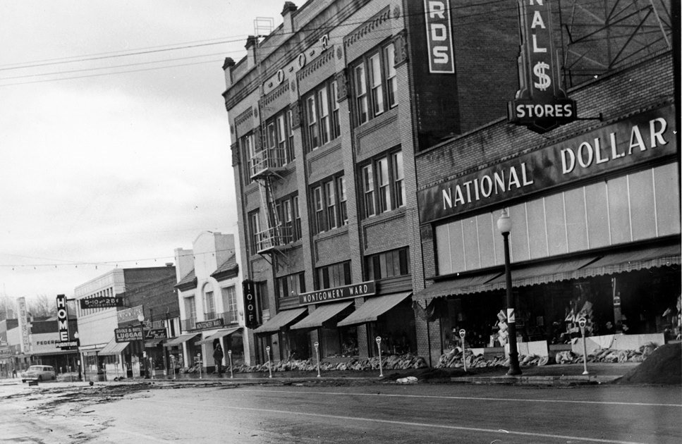 The Barengo Building (right), which housed the National Dollar Store from 1936 to 1970, was just one of many shopping destinations on North Sierra Street. Others included the Montgomery Ward store just to its south, Sears, J.C. Penney's, and Home Furniture.