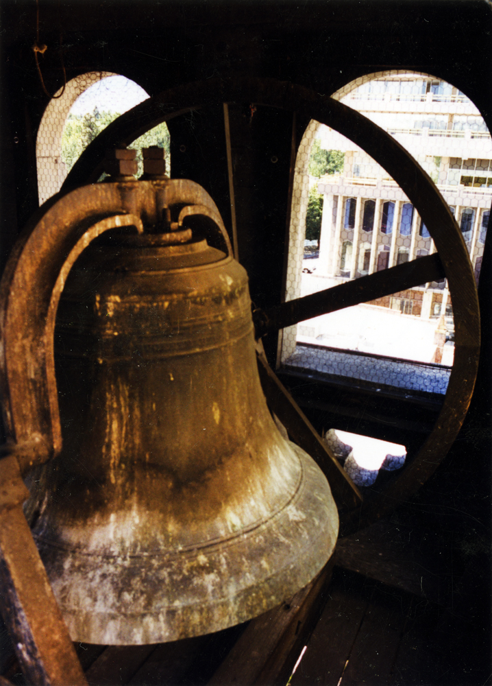 The bell from the 1871 church was moved to the new church in 1926. It was the gift of Judge William Webster of Washoe County. The bell, weighing in at one ton, was cast in San Francisco from two smaller bells. It is 40 inches in diameter and hangs 60 feet from the ground in the 75-foot-high bell tower. | Source: First United Methodist ChurchDownload Original File