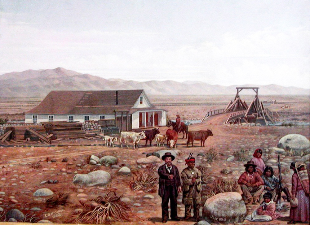 This painting of Myron Lake was painted in 1882 by a local portrait painter named Cyrinus McClellan. Lake is depicted at a point decades earlier with Chief Winnemucca and other members of the Paiute tribe, with his modest inn and wooden bridge behind them. | Creator: Cyrinus McClellan | Date: 1882 | Source: VSA Arts of Nevada at the Lake MansionDownload Original File
