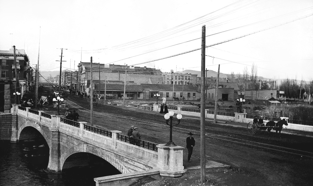 By the early 1900s, Reno had become a small but thriving transportation hub with three major railroads. Beginning in 1906, a streetcar line ran across the Virginia Street Bridge to serve areas to the south. The tracks can clearly be seen in this photograph ca. 1906. | Date: ca. 1906 | Source: Special Collections, University of Nevada, Reno Libraries Download Original File