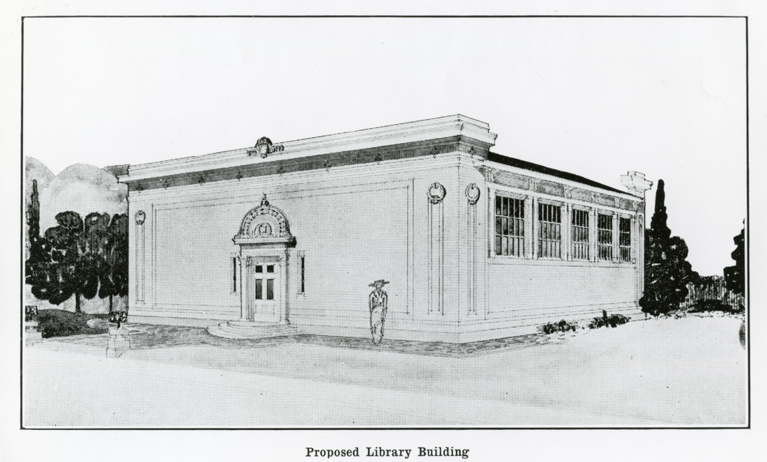 An architectural drawing by Frederic DeLongchamps of the proposed library building.