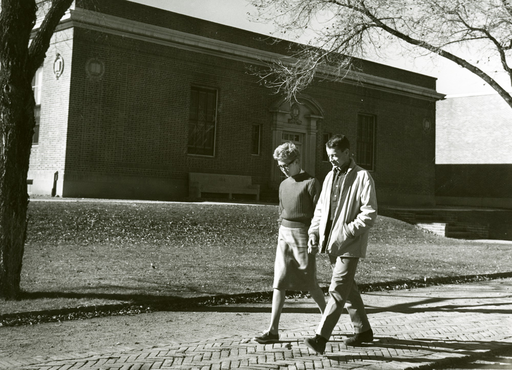 A couple walks on the Quadrangle sidewalk in front of the Journalism Building, ca. 1955. Journalism occupied the building from 1947-1967. | Date: ca. 1955 | Source: University Archives, University of Nevada, Reno Libraries Download Original File