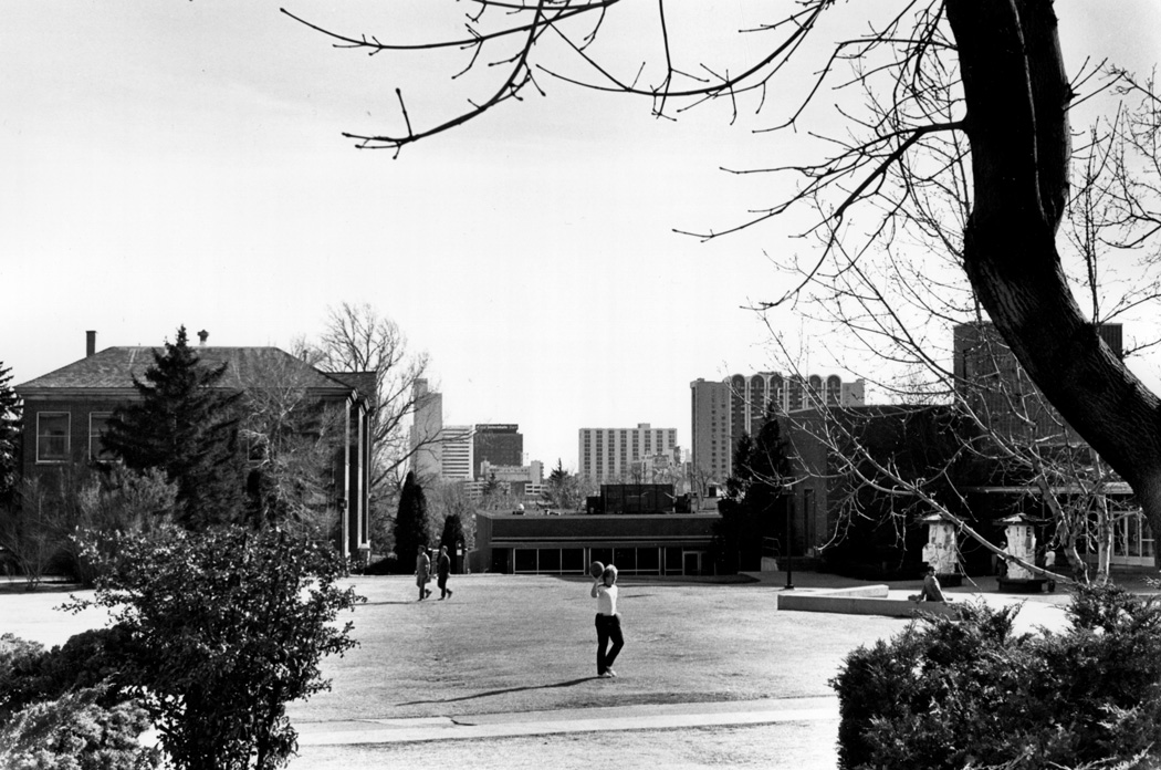 In 1985, students enjoy the day on the grass behind the old Agriculture and Jot Travis buildings. The Reno skyline is seen in the distance. | Date: 1985 | Source: University Archives, University of Nevada, Reno LibrariesDownload Original File