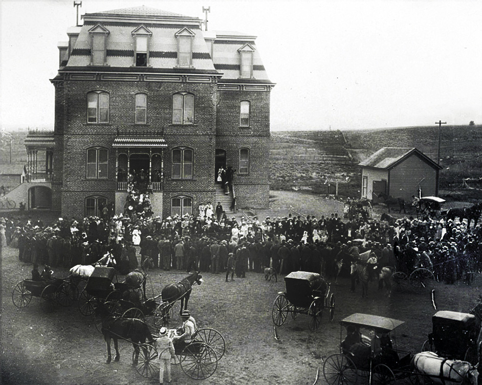 A large crowd of people with their horses and buggies gather outside of Morrill Hall in 1898.