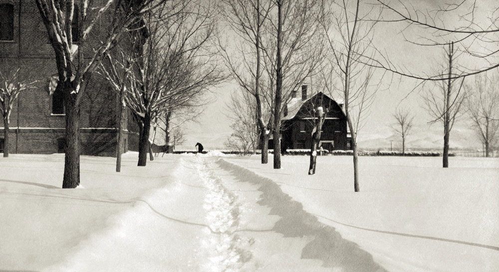A path across Quad through deep snow with the University President's House in the distance, ca.1911.