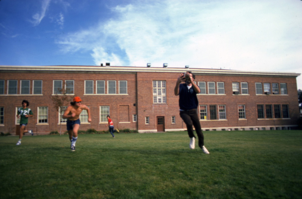 Backdrop to football ID: 648 | This file appears in: Thompson Building Students play informal football behind the Thompson Building in the late 1960s. | Date: 1960s | Source: University Archives, University of Nevada, Reno Libraries Download Original File SourceUniversity Archives, University of Nevada, Reno LibrariesDate1960s "Backdrop to football" appears in: Thompson Building