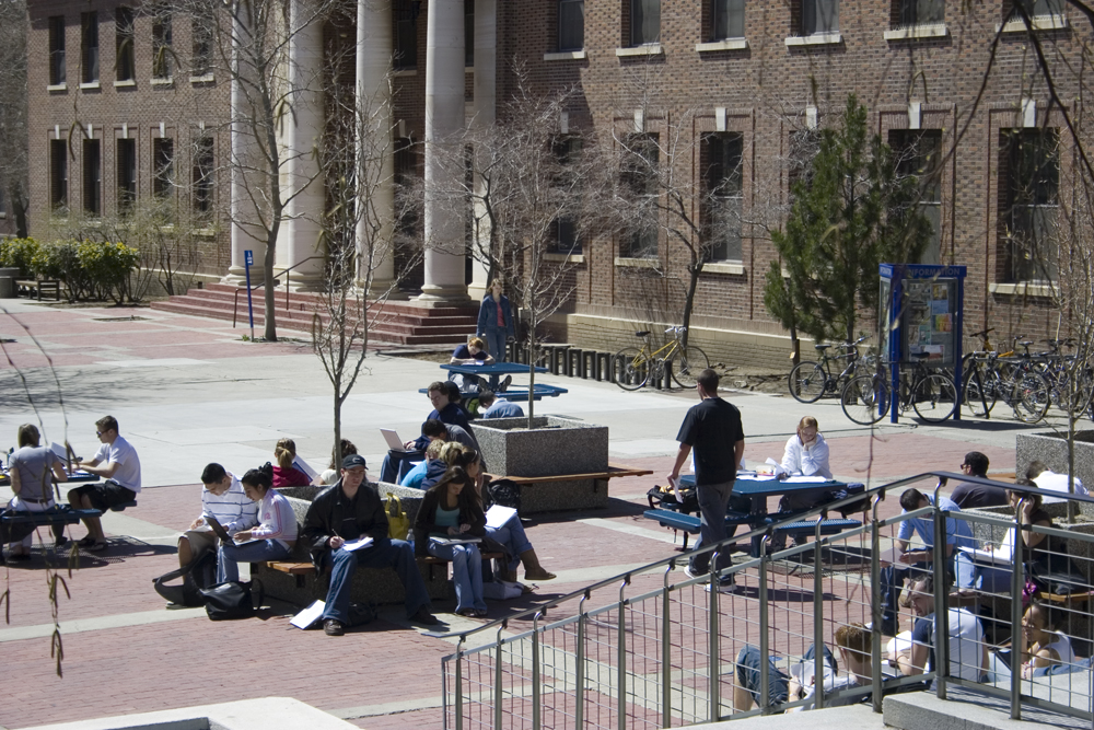 In 2006, students gather at tables in the paved public area between the Thompson Building and the Getchell Library. | Creator: Sara Brown | Date: 2006 | Source: University Archives, University of Nevada, Reno LibrariesDownload Original File