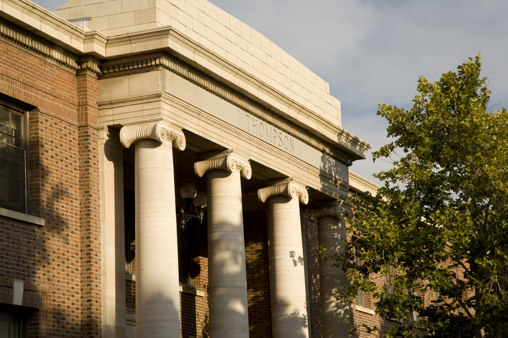 "Thompson" carved in the frieze at the front entrance of the building. Like many of the classic buildings on the university quad, the Thompson Building has Ionic pillars at the entrance. | Creator: Theresa Danna-Douglas | Source: University Archives, University of Nevada, Reno LibrariesDownload Original File