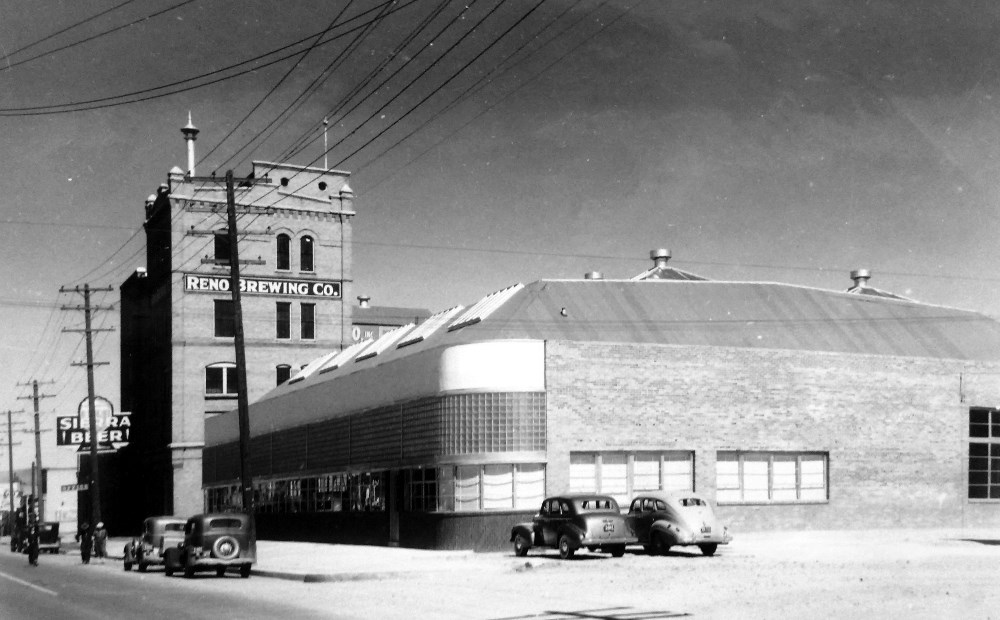 This photo, taken around 1940, shows the main brewery building still standing in the background. The bottling plant in the foreground is where beer was canned and bottled for sale. | Date: ca. 1940 | Source: Nevada Historical Society Download Original File