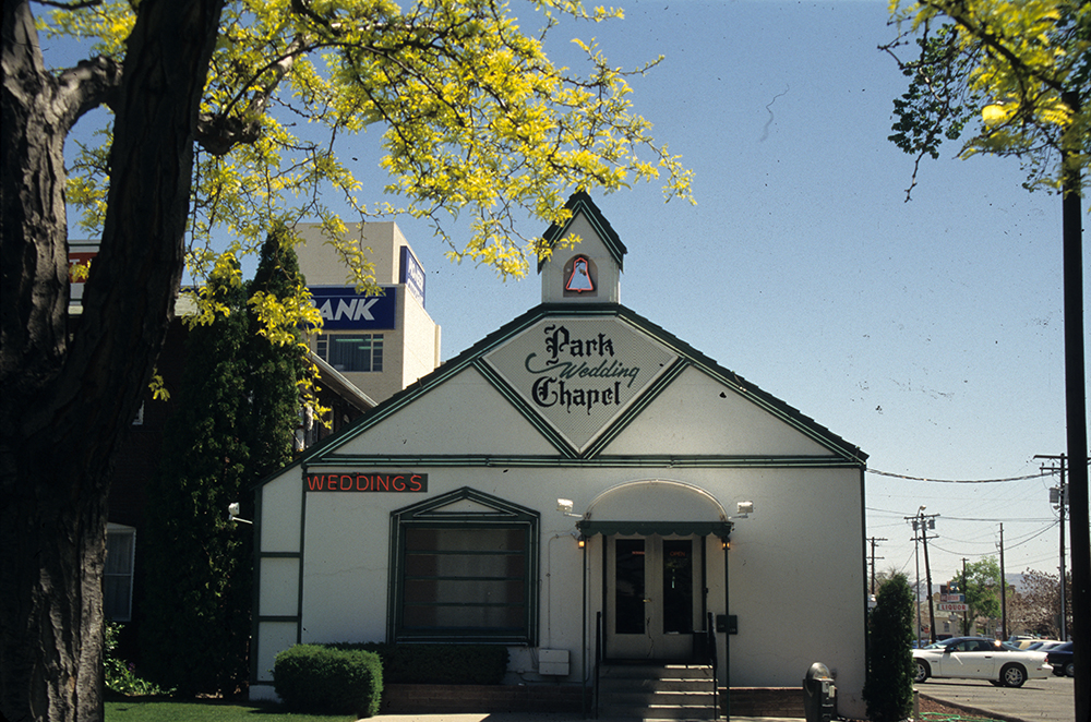 Although undergoing various renovations of the façade and paint colors, the Park Wedding Chapel remained a constant presence in the heart of Reno for decades. | Creator: Mella Rothwell Harmon | Source: Special Collections, University of Nevada, Reno LibrariesDownload Original File