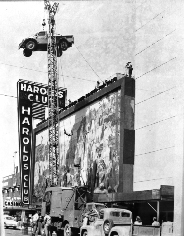 Harolds Club construction ID: 841 | This file appears in: Martin Iron Works The company's Dodge Power Wagon helps erect the top floor addition to Harolds Club in 1954. | Date: 1954 Download Original File Date1954 "Harolds Club construction" appears in: Martin Iron Works