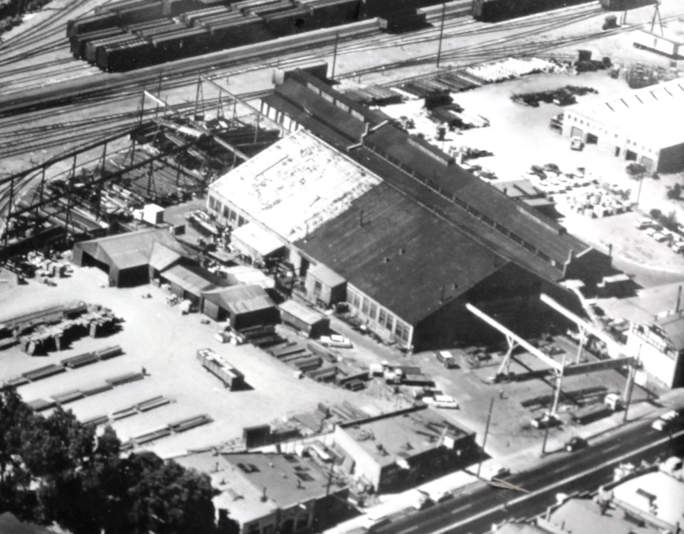 With 4th Street at the bottom of the photo, an aerial view of the Martin Iron Works site shows the original A-frame construction of the main shop building before a fire in 1962 that required the entire section to be rebuilt.