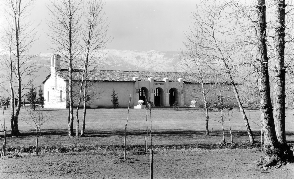 A view of the California Building soon after its construction shows its peaceful setting on the west side of Reno, in the shadow of the surrounding mountains. Donald McLaren, the official landscape engineer of the Exposition, was clear about his intention "to preserve in its entirety the scenic beauty of Idlewild Park."