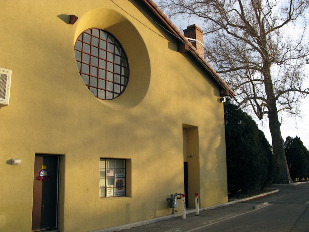 The west elevation of the building is highlighted by an 8-foot diameter circular window at the center of the wall. The recessed opening is splayed outward so that the diameter is greater at the outside face of wall than at the window frame at the inside face.