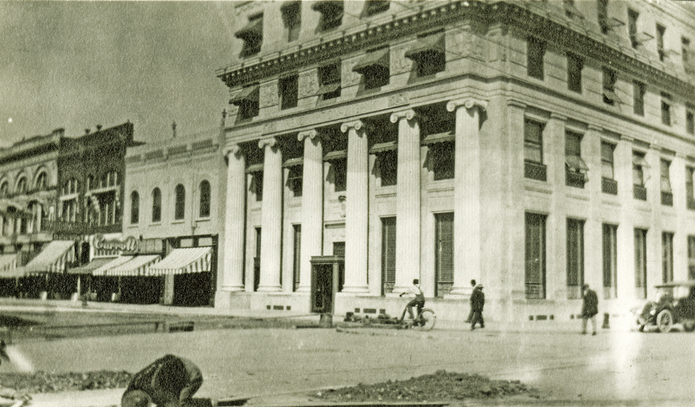 An early photo of the bank shows ongoing improvements to Virginia Street as the city moved into the automobile age. Many of the windows are open, to provide ventilation. | Source: Special Collections, University of Nevada, Reno LibrariesDownload Original File