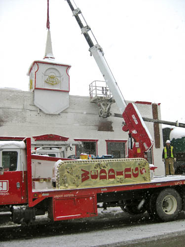 Remodeling Workers removed the steeple and sign from the Heart of Reno wedding chapel in 2009. Creator: Dennis Myers Date: 2009
