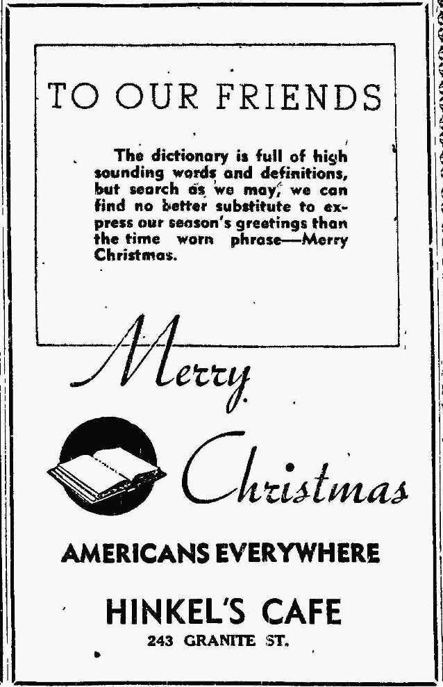 Hinkel's Cafe ad In a newspaper ad from 1943, Hinkel conveyed Christmas greetings to "Americans Everywhere." Born in Germany, Hinkel may have found it especially important to strike a patriotic note during World War II, as the United States fought his native country. Source: Reno Evening Gazette Date: December 24, 1943