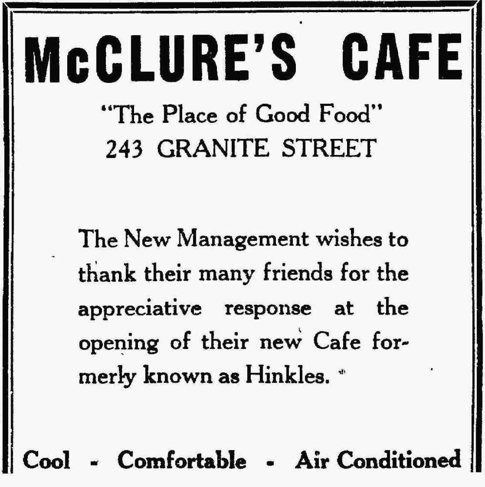 Gene ran Hinkel’s Café on Granite Street with his wife, Marie, for three years. In 1945, they sold the place to Clarence McClure, who renamed the place McClure’s Café, dubbing it “The Place of Good Food.”