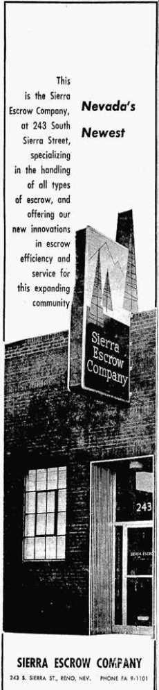 Sierra Escrow Sierra Escrow opened in the building in 1960. Source: Reno Evening Gazette Date: December 16, 1960