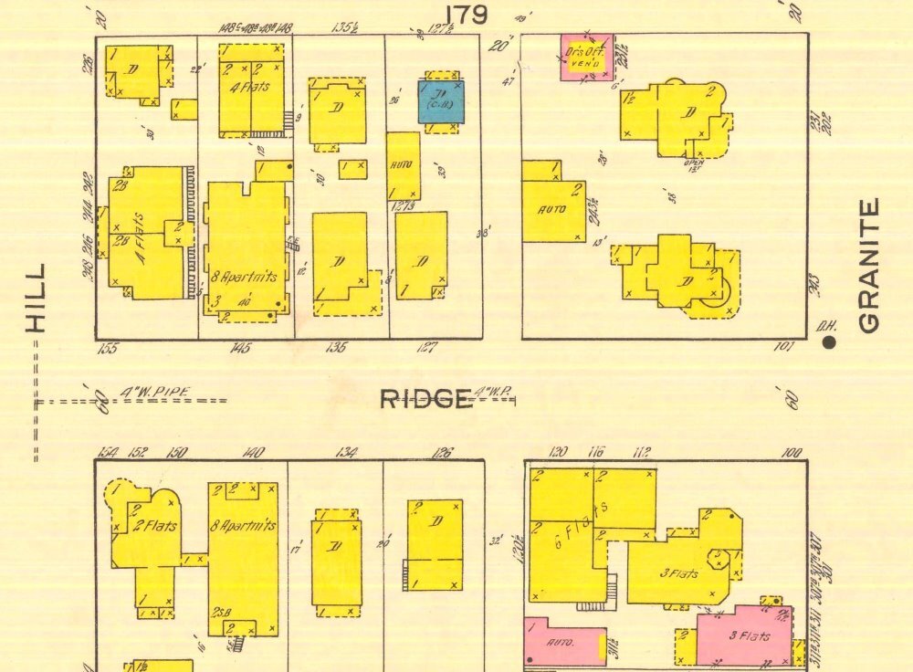 Granite Street, 1918 The 1918 Sanborn fire insurance map shows the layout of the area that year. Yellow indicates a wood frame structure, while pink symbolizes brick. In 1918 a single-family frame house stood at the future site of Hinkel's Cafe, at the corner of Granite and Ridge Streets. Source: U.S. Library of Congress Creator: Sanborn Fire Insurance Company Date: 1918