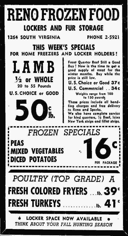 Diversified business, 1954 By the mid-1950s, Reno Frozen Food Lockers sold frozen vegetables and a variety of meats in addition to offering locker rentals and fur storage. Source: Reno Evening Gazette Date: July 22, 1954