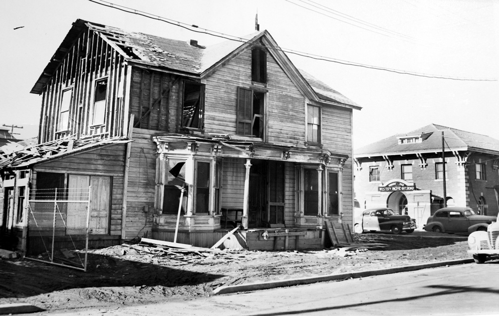 Out with the Old In order to construct a new addition to the Alpine Glass building in 1955, the historic CJ Brookins house, located next door since the 1880s, was purchased by the Mt. Zion Baptist Church and moved to a new site on Montello Street for use as a youth center. Across 4th Street stands the Western Pacific (formerly NCO) Railroad Depot. Source: Nevada Historical Society Date: 1955