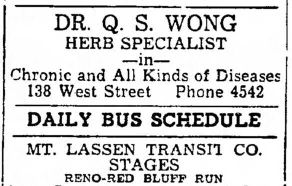 Chinese herbalist and chiropractor Q.S. Wong opened his practice at 138 West Street, a building whose construction he likely financed himself, in 1924. A Reno resident since at least 1913, Wong was a well-respected local businessman who occasionally found himself in the crosshairs of a community not entirely free of prejudice toward his ethnicity and traditional approach to medicine. At least twice, charges were levied against him: first in 1917 for cohabitating with a white woman, and again in 1941 for involuntary manslaughter after one of his patients died of epilepsy.