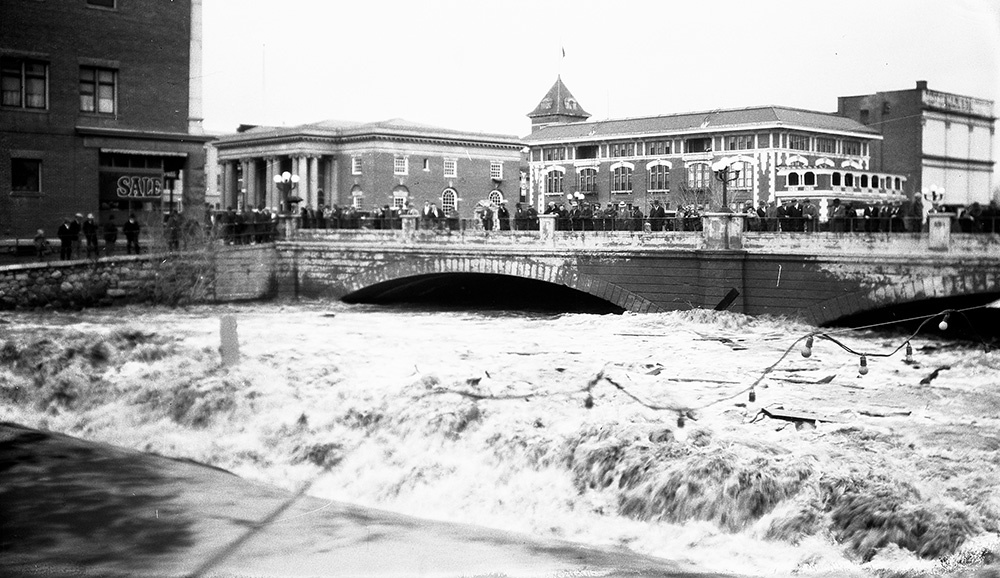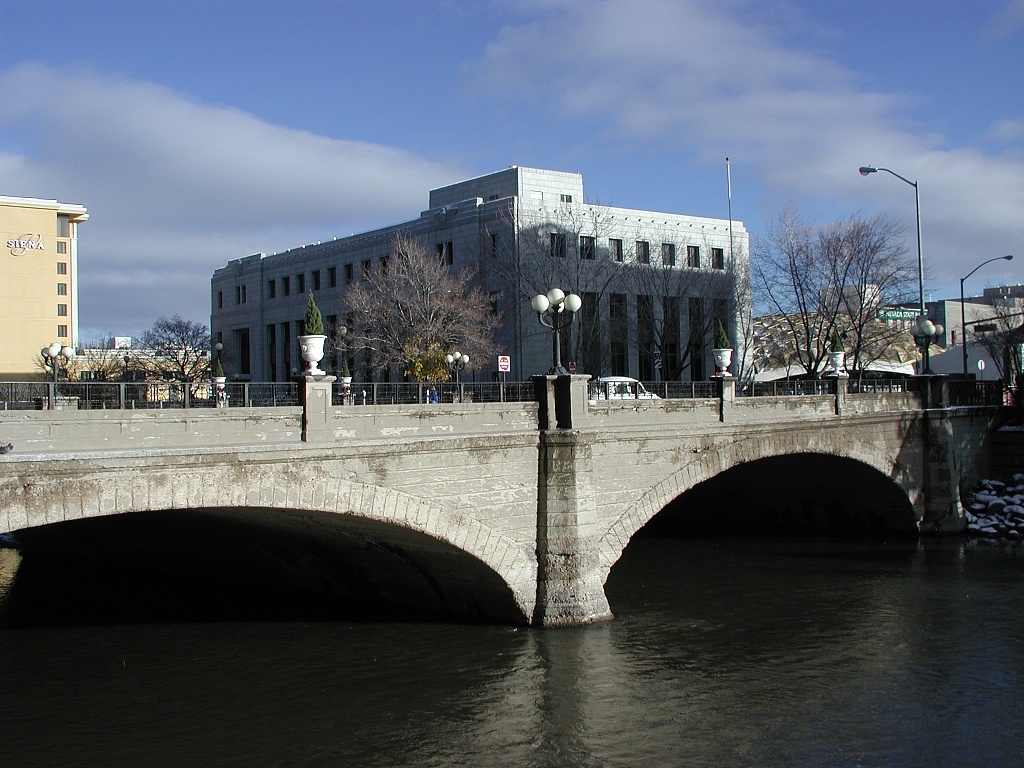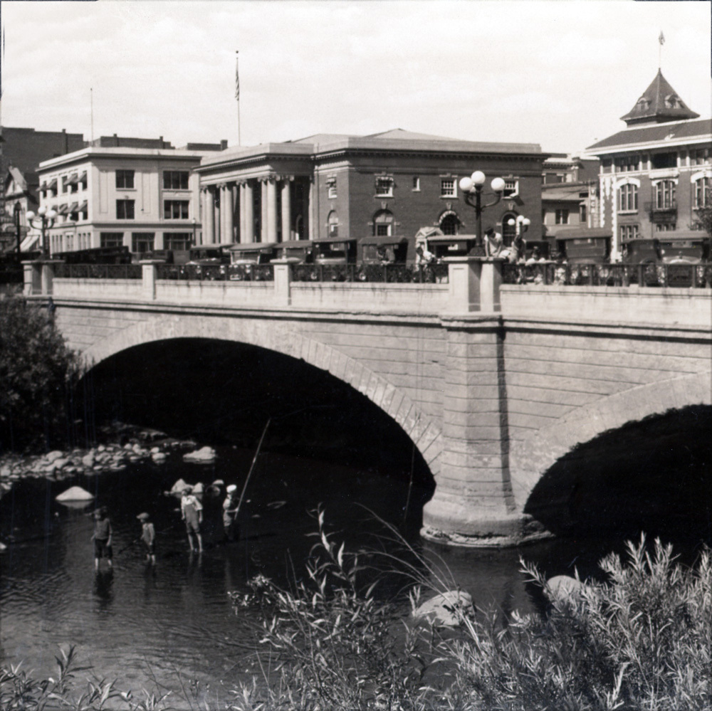 Having finally acquired the bridge from Lake after a prolonged court battle, Washoe County hired a company from Des Moines, Iowa in 1877 to construct an iron bowstring arch truss bridge to replace the wooden one. The “iron bridge,” as the community called it, cost about $16,000 and featured a separate walkway to keep pedestrians safe from passing horses and buggies. With the dawn of the twentieth century came calls for a wider, more permanent, and elegant structure. Architect John B. Leonard of San Francisco chose a Classical design to complement the bridge’s urban setting. Built in 1905 by Cotton Brothers and Company of Oakland, California, the new span was one of the first reinforced concrete bridges in Nevada, with a classical design that quickly became a major architectural focal point.