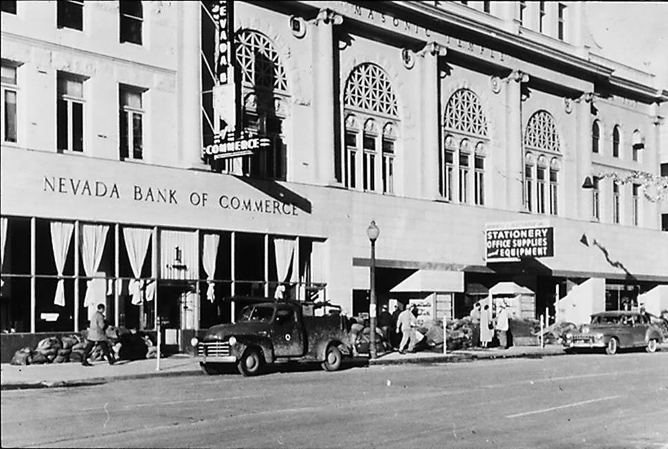 By 1905, the old Masonic Hall on Commercial Row was no longer adequate for the growing membership and responsibilities of Reno Masonic Lodge No. 13. The new building commanded a prominent position at the northwest corner of the new Virginia Street Bridge, formerly the site of a livery stable. It was yet another expression of Reno’s growing maturity. The officers of the Grand Lodge of the State of Nevada placed the cornerstone on the building on September 16, 1905. The Temple was an elaborate two-tone, three-story Romanesque structure. The members must have swelled with price when they attended their first meeting on December 8, 1906. In addition to serving as the Masonic Temple, the building housed retail stores on the ground floor. A four-story expansion wing facing West First Street, designed by architect Russell Mills, was completed in 1955.