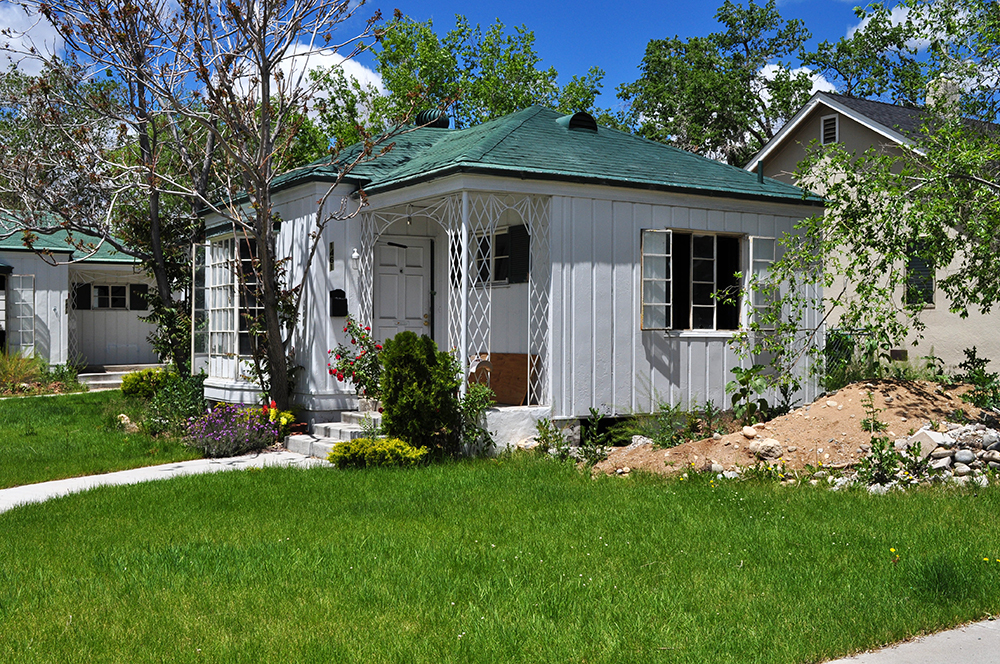 With Reno’s housing market continuing to boom, Roland Giroux, known as “Joe,” developed a complex of small detached apartments at 1307 South Virginia Street, between Arroyo and Pueblo streets, on what was then the edge of town. Giroux’s intent was to attract Reno’s transient work force, tourists, and the ubiquitous divorce-seekers. Named the El Reno Apartments, the complex consisted of 15 Lea Steel homes. Each unit was furnished and fitted out with the latest of Westinghouse kitchen appliances, metal kitchen cabinets, comfortable and efficient floor plans, decorative exteriors, and all the benefits of steel buildings: permanence, as well as resistance to fire, termites, dry rot, and earthquakes.