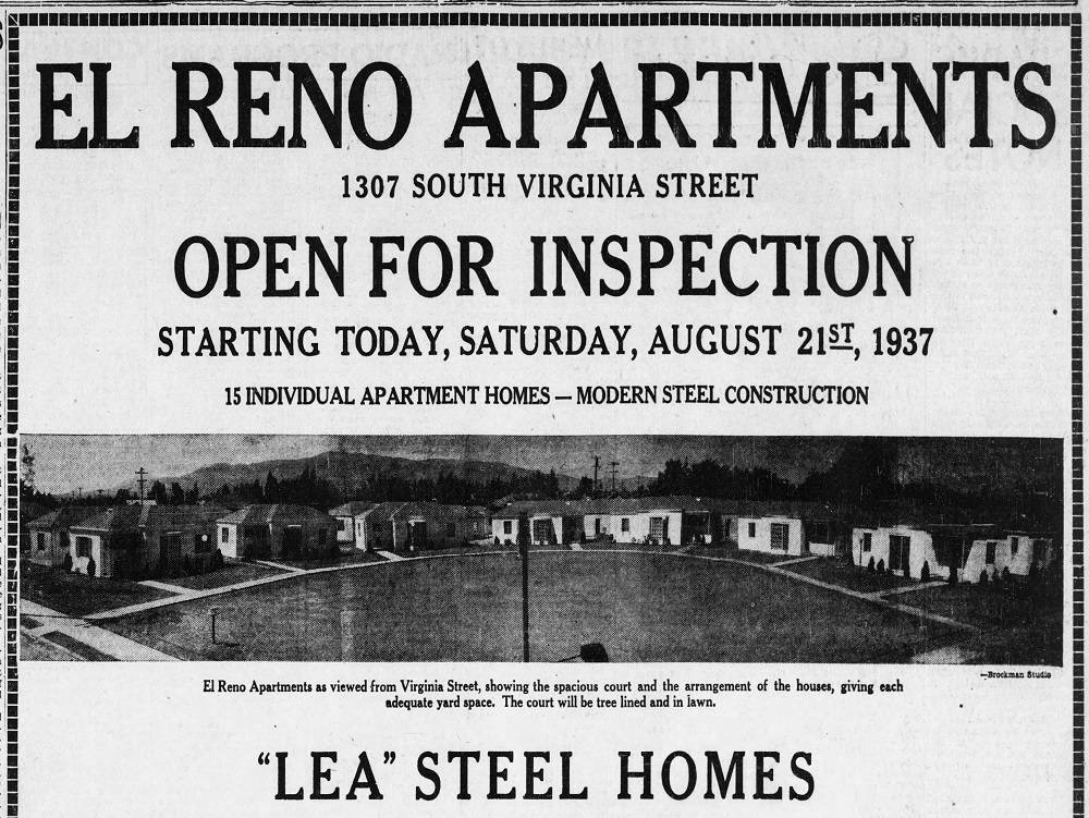 Open for inspection, 1937 An advertisement published in the Reno Evening Gazette on August 21, 1937 invites the public to inspect the new El Reno Apartments, and depicts their original arrangement as viewed from South Virginia Street. Source: Reno Evening Gazette Date: 1937